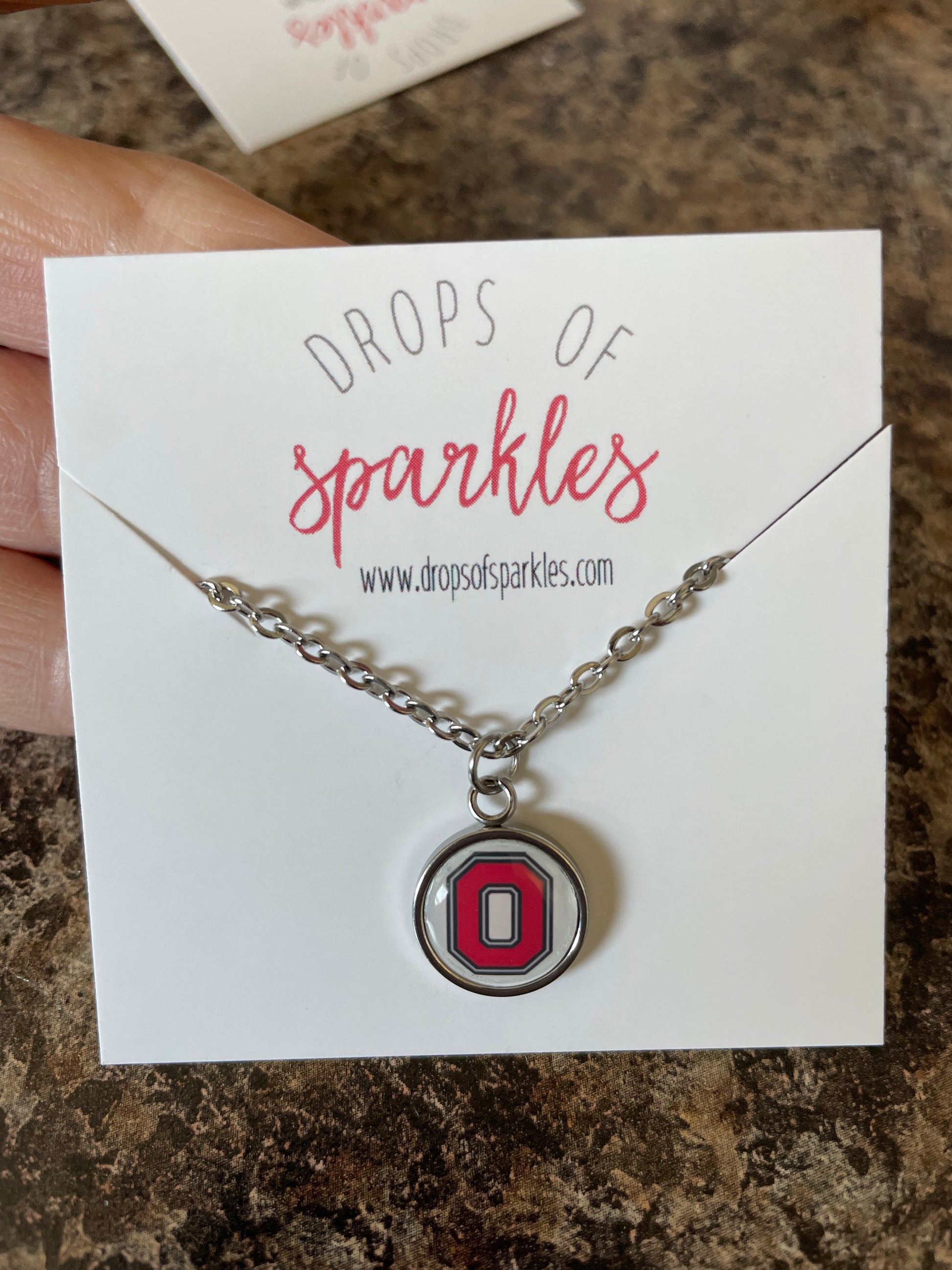 Complete your uniform with this simple but classic pendant necklace! These are made with an 18 inch stainless steel cable chain necklaces with lobster clasps. Choose between black script Ohio, red block O, or Brutus buckeye. Pairs perfectly with the studs earrings! I can do any image! Message me for a custom order!