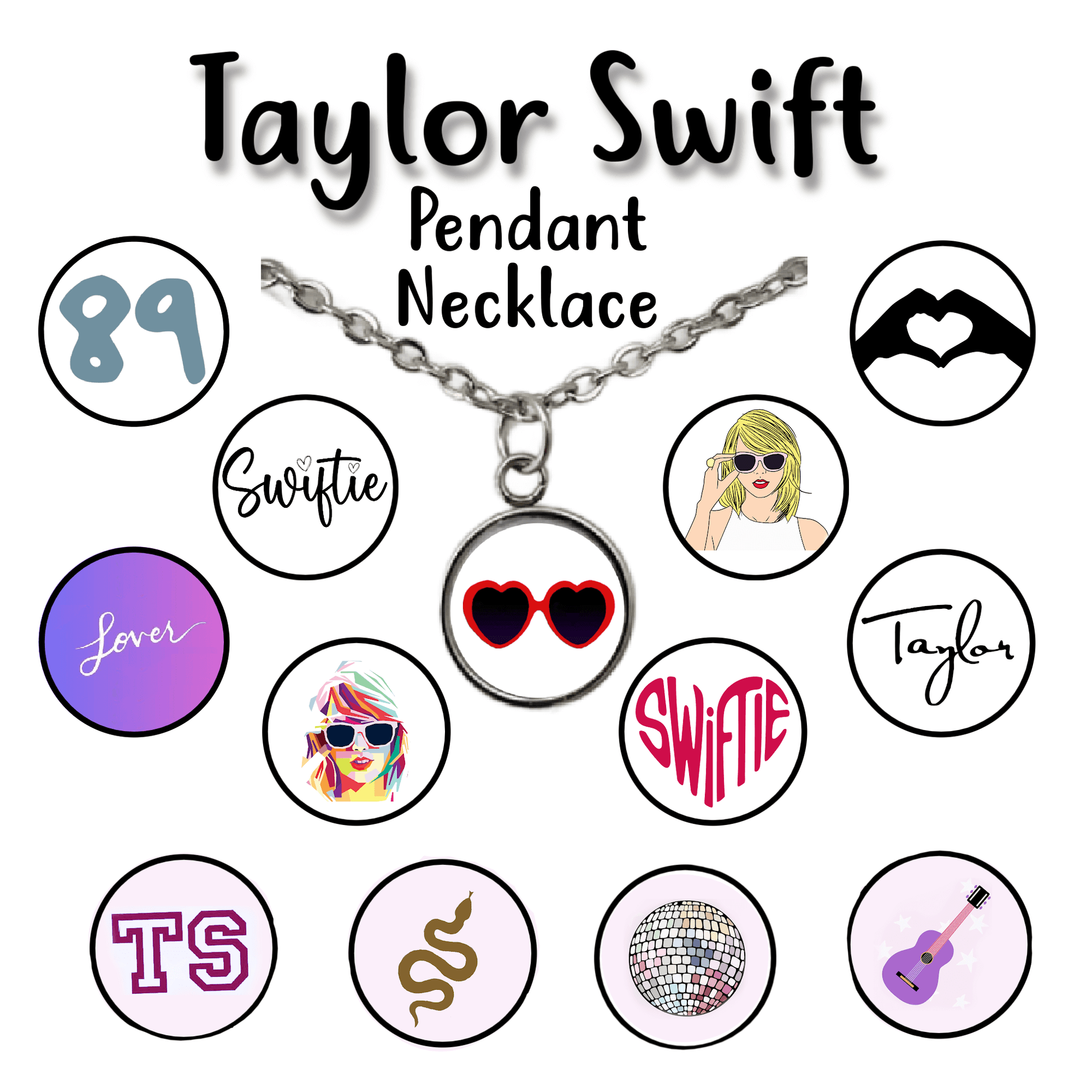 Express your unending love for Taylor Swift with this super fun pendant necklace. Choose from one of her iconic symbols like red heart glasses, "Lover", heart hands, and "89" and newly added Watercolor Taylor, signature Taylor, pink "Swiftie heart", purple guitar, snake, disco ball and "TS" to make a necklace that suites your mood or outfit! This necklace goes perfectly with any of the Taylor Swift stud earrings! This chain measures 18 inches long, made with stainless steel and the pendant measures 12mm or half an inch big and is made with stainless steel nickel free settings.
